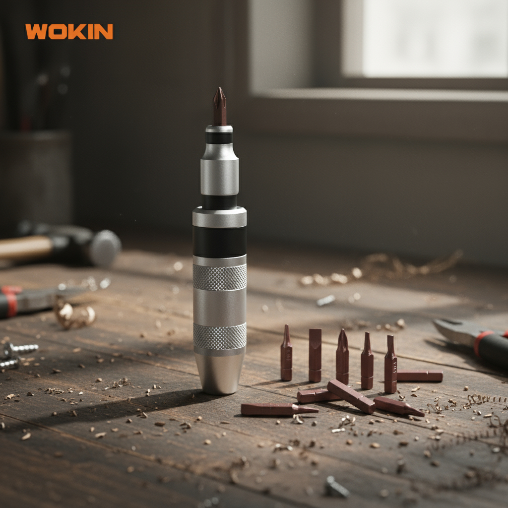 1 destornillador de impacto con adaptador de puntas, material CRV, tratamiento térmico 13 puntas S2 de 35 mm: SL5, SL6, SL8, SL9 PH1, PH2, PH3, PH4 H4, H5, H6, H8 Embalaje: caja de acero con funda de color