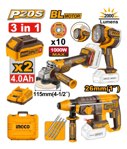 Kit Ingco 20v Rotomartillo + Amoladora Angular + Linterna