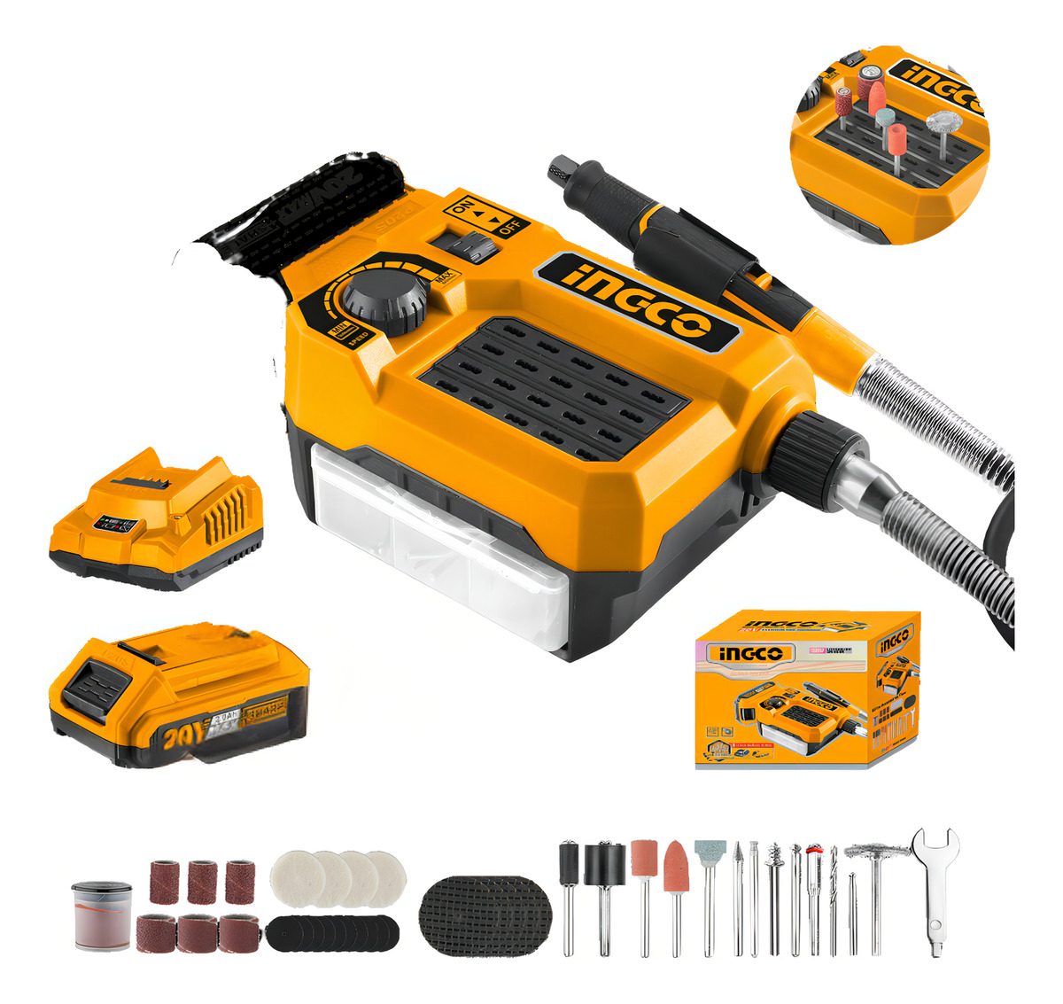MINITORNO A BATERIA 20V P20S C/EJE FLEXIBLE EN CAJA S/BAT + 40 ACCESORIOS