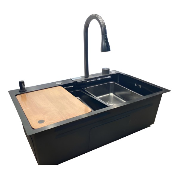 Griferia Con funcion de salida Baja lineal (Cascada) y Monocomando alto extensible con funcion chorro o lluvia .